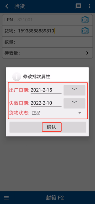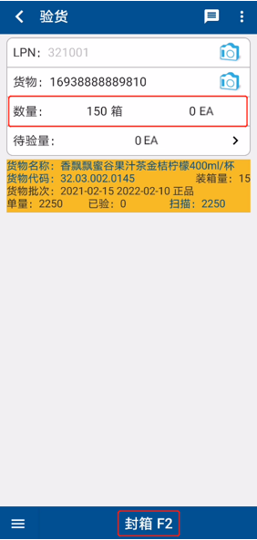 (1)进入【验货】界面。确保入库的货物品类、装箱量、保质期、生产日期等信息录入准确(图1.2.8——图1.2.11)。