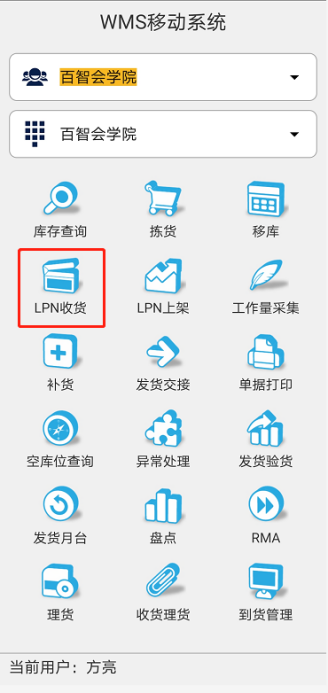 (2)收货组员使用RF终端点击进入【WMS】系统,在主界面点击进入【LPN收货】界面(图1.3.5、图1.3.6、图1.3.7)。