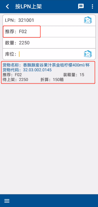 ② Scan the LPN label on the palletized goods at [LPN], and the system identifies the goods information and recommends the corresponding inventory location (Figure 1.4.11, Figure 1.4.12).