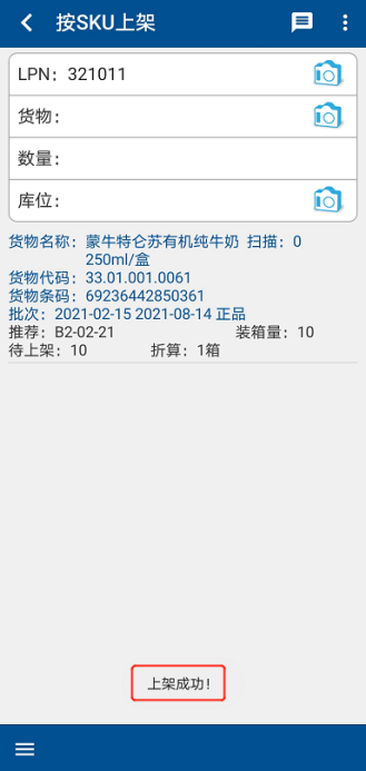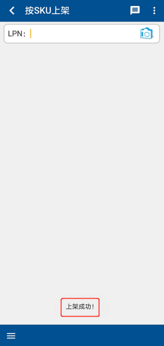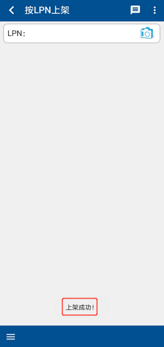 上架完成后,在【LPN上架】界面中【库位】处,扫描目标库位条码,系统提示【上架成功】,即上架作业完成,重复以上操作,直至整箱入库作业全部完成(图1.4.7、图1.4.8)。