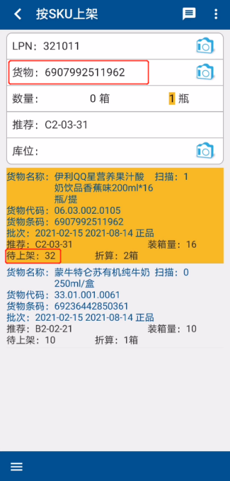 ③ After the shelving team members transfer the bulk goods to the target inventory location with a forklift, they scan the barcode of the goods at the [Goods], and the system prompts the SKU to be put on the shelf quantity and the storage location to be put on the shelf (Figure 1.4.13, Figure 1.4.14).