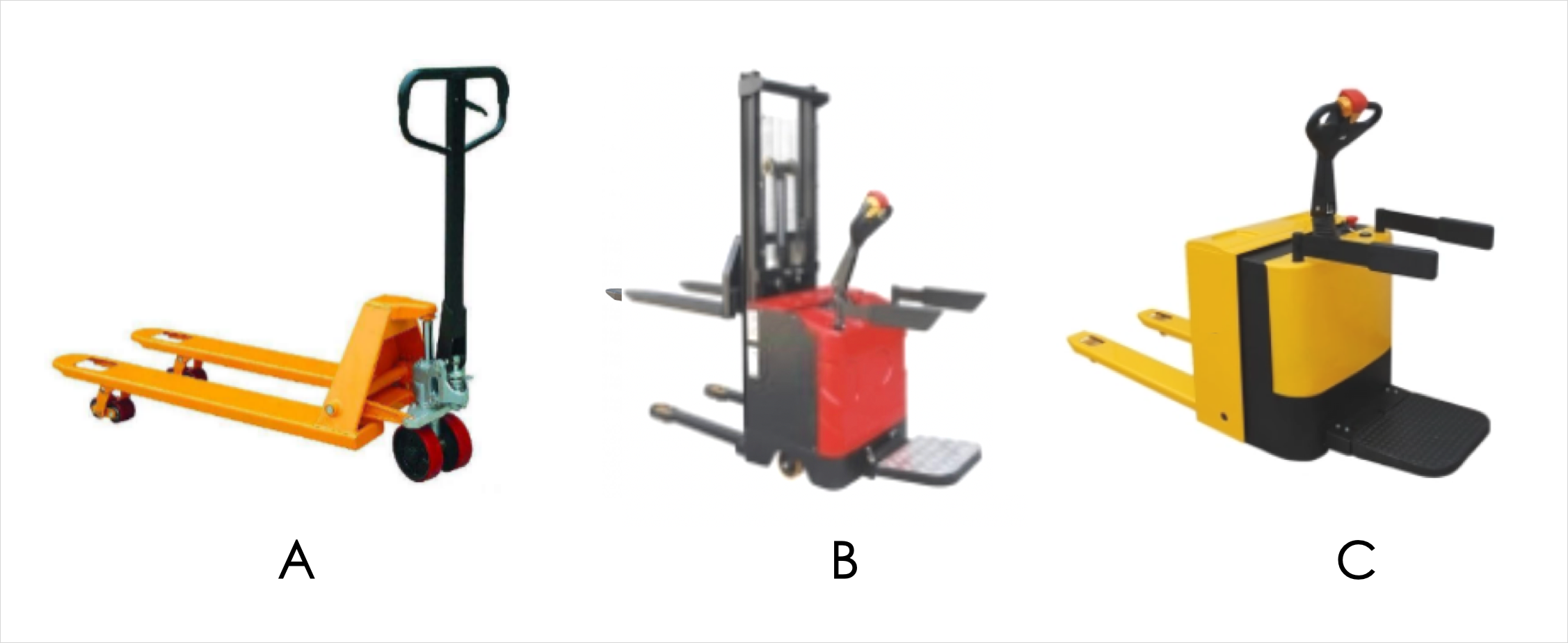 1.上图中,( )主要用于成件托盘货物进行装卸堆高堆垛和短距离运输作业,而且属于轮式搬运车辆。// [!code focus]