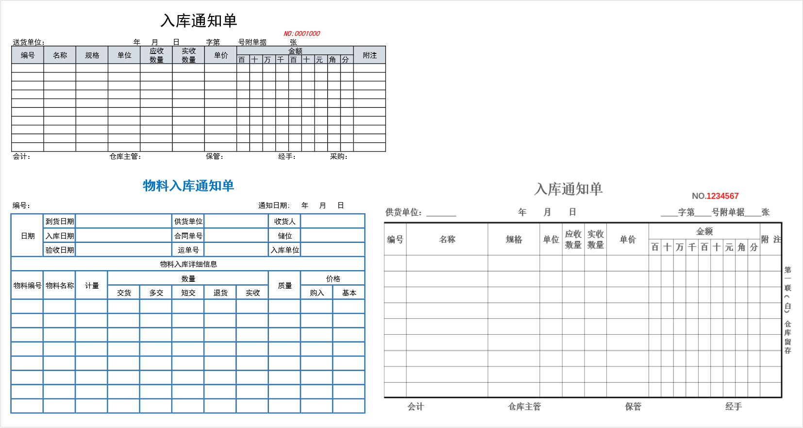 入库通知单的内容一般根据用途不同,可包括编号、日期、订单号、供应商、存货人、物品编号、物品属性、物品件数、物品重量、包装材质及规格、存放要求等信息(参考表1.1.1、其他样例见图1.1.2)。