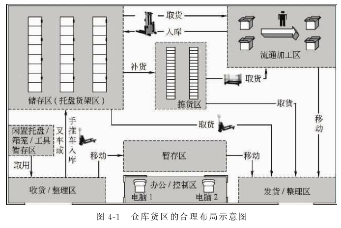 Familiarity with the internal area division and functions of the warehouse is beneficial for efficiently completing warehousing operations. According to the operation needs, the warehouse is usually divided into multiple functional areas, the most common of which are the receiving area, storage area, picking area, distribution processing area, and shipping area, etc. (Figure 1.1.3).