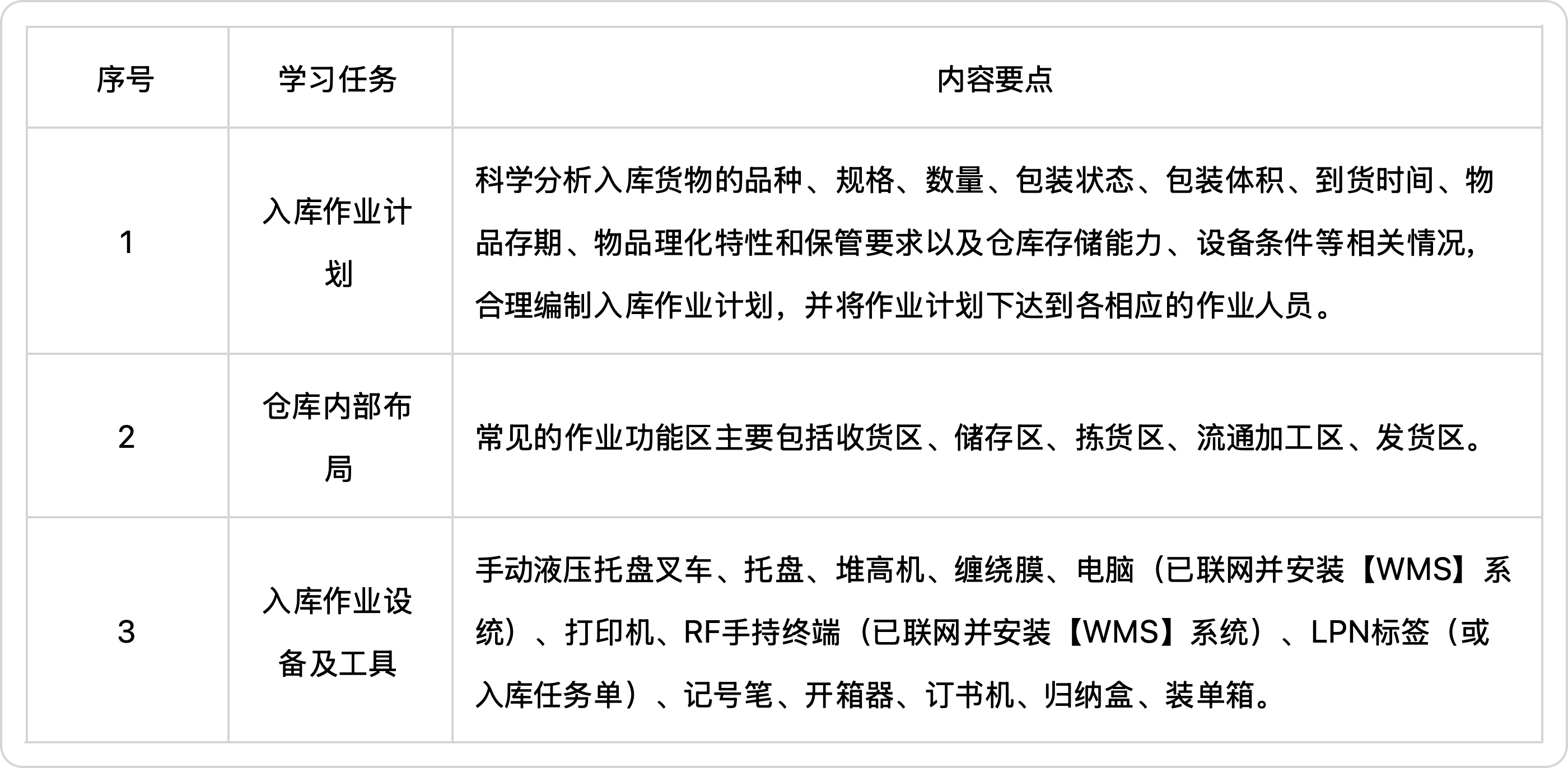 掌握入库准备的内容,能分析入库通知中的货物信息及相关情况,根据存储特性和数量等资料,制定入库作业计划。