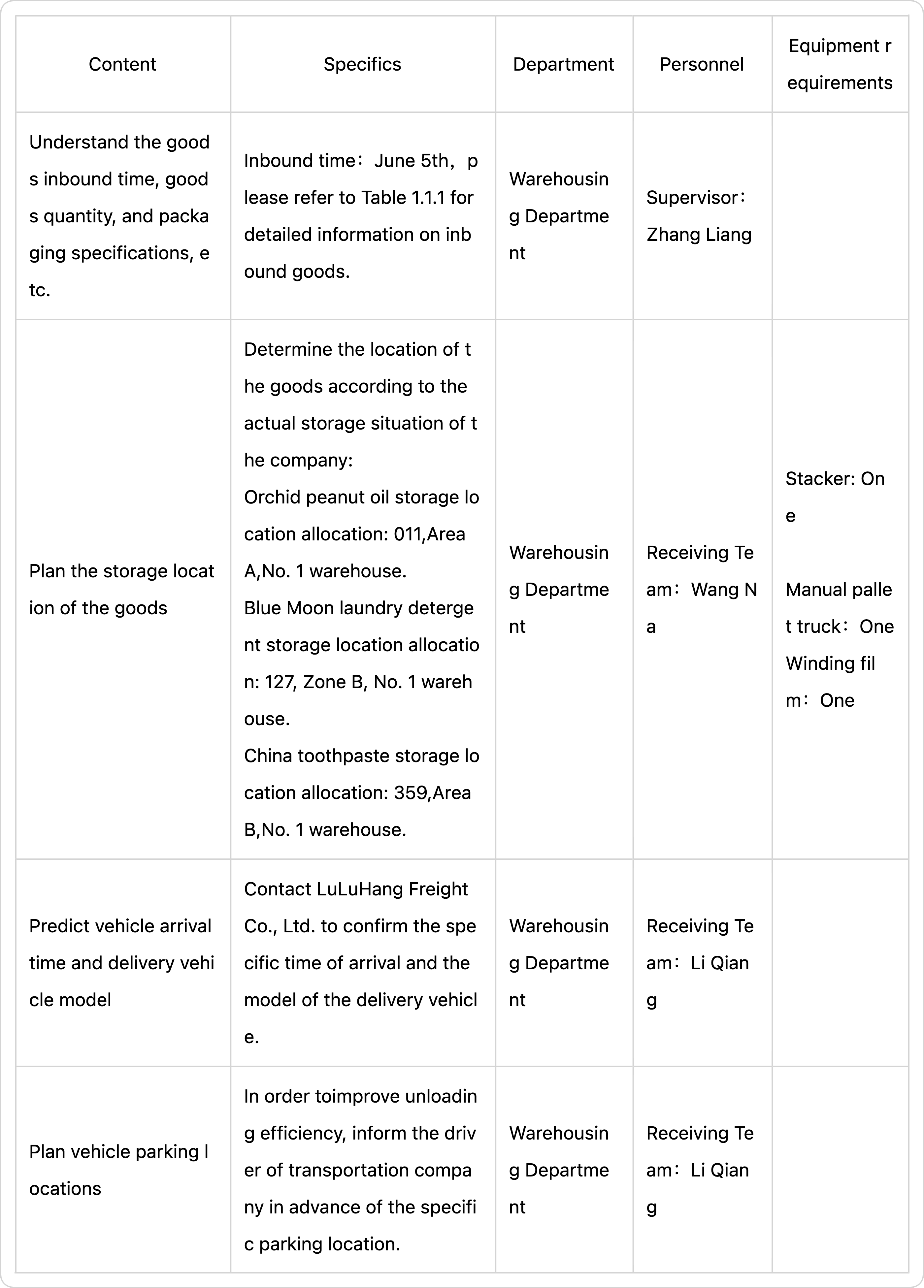 Leader Zhang of Receiving Team: OK, I will confirm with the salesman of suppliers in advance to confirm the time of delivery, commodity information, and other matters such as arranging the personnel to receive the goods and prepare inbound operation document.