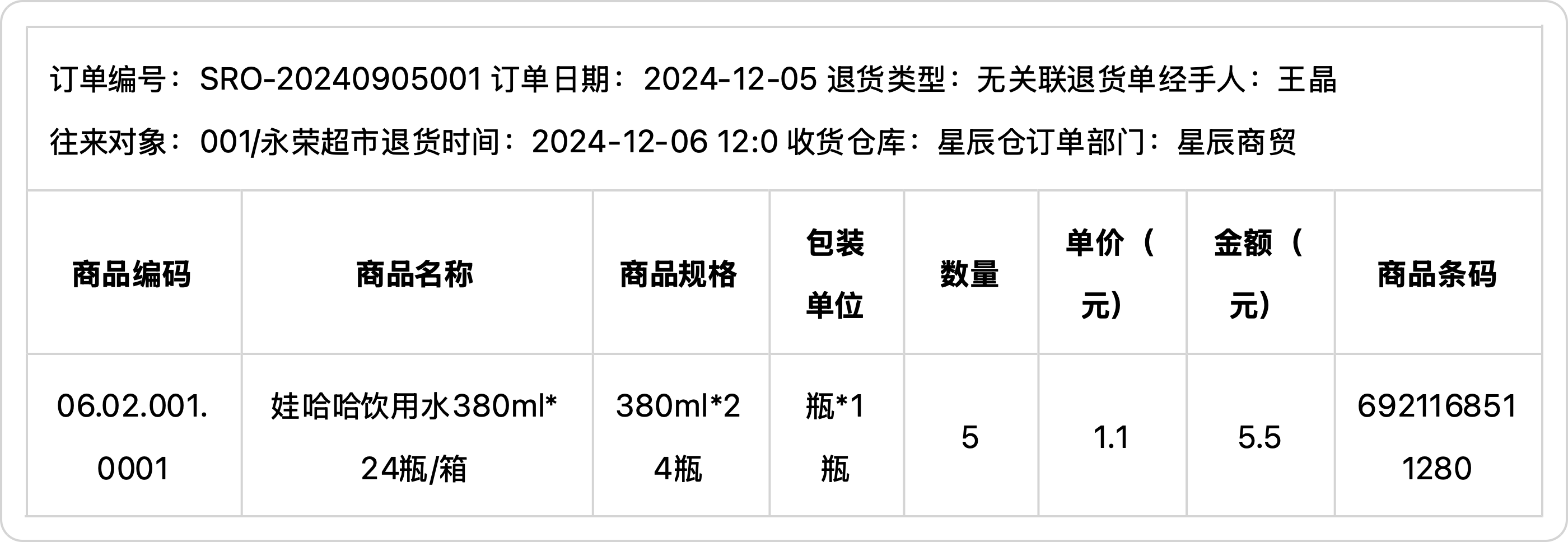 2.在ERP创建了自建一份销售退货订单,具体信息可参考如下: