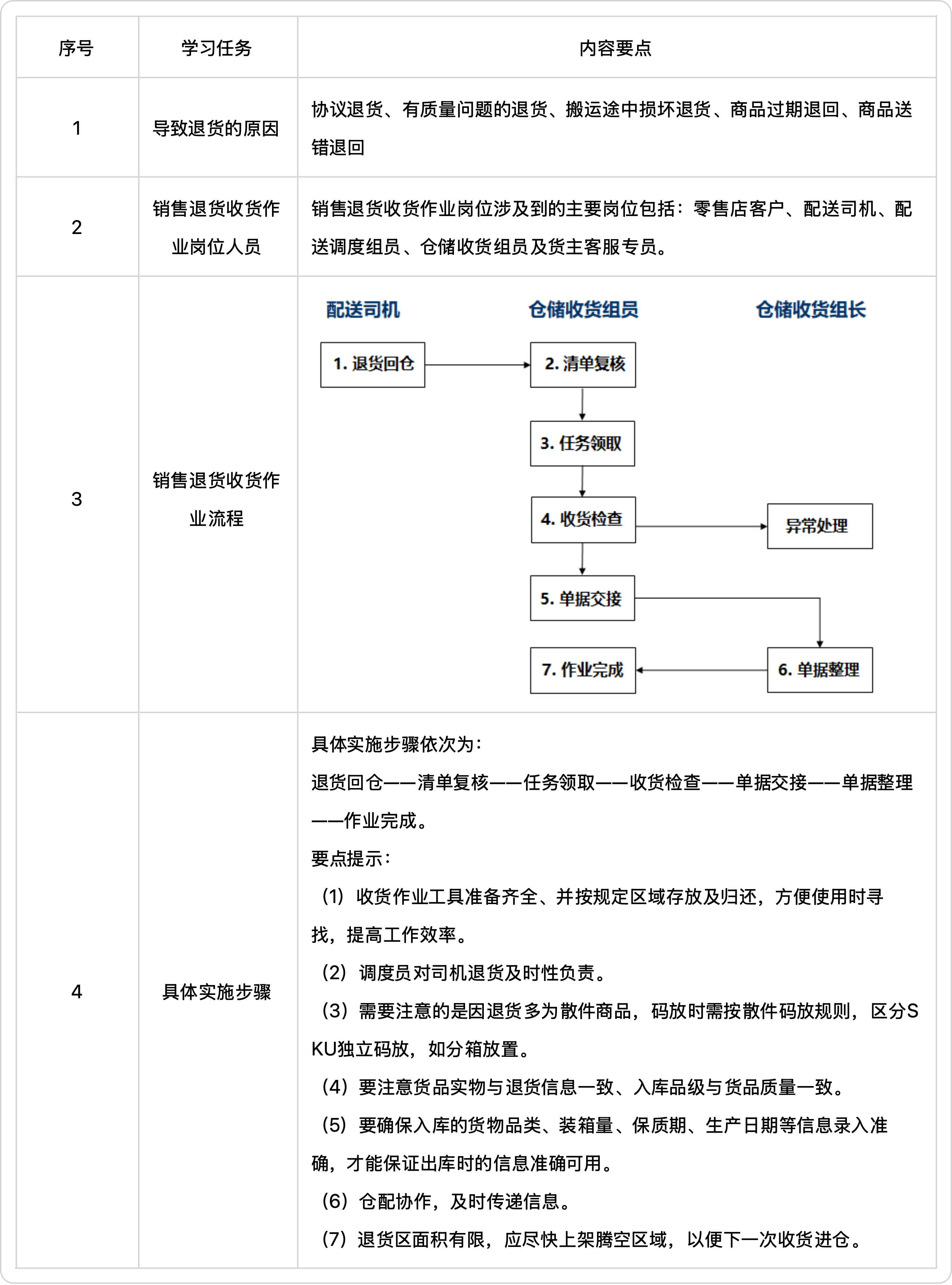 以下词条为销售退货收货作业具体步骤,如退货回仓为第一步,则用数字标明①,后续步骤请按照作业顺序依次进行编号。// [!code focus]