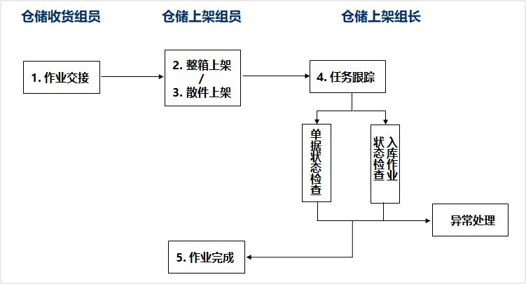 7.异常处理:上架组员在上架过程中出现异常,反馈至上架组长,协调处理。