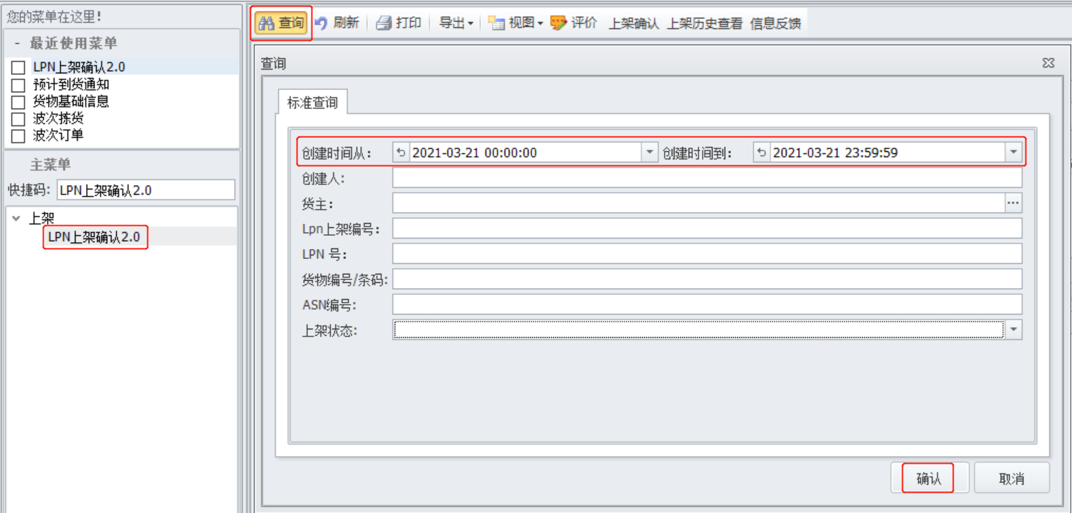 ① 在电脑端【WMS】系统中选择【LPN上架确认2.0】菜单;