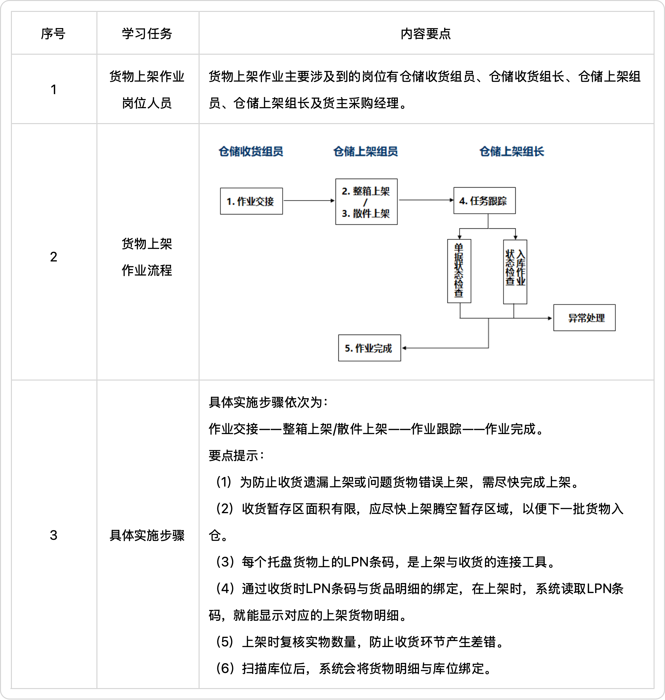 按照货物上架工作岗位将具体步骤进行梳理,如图1.4.1所示: