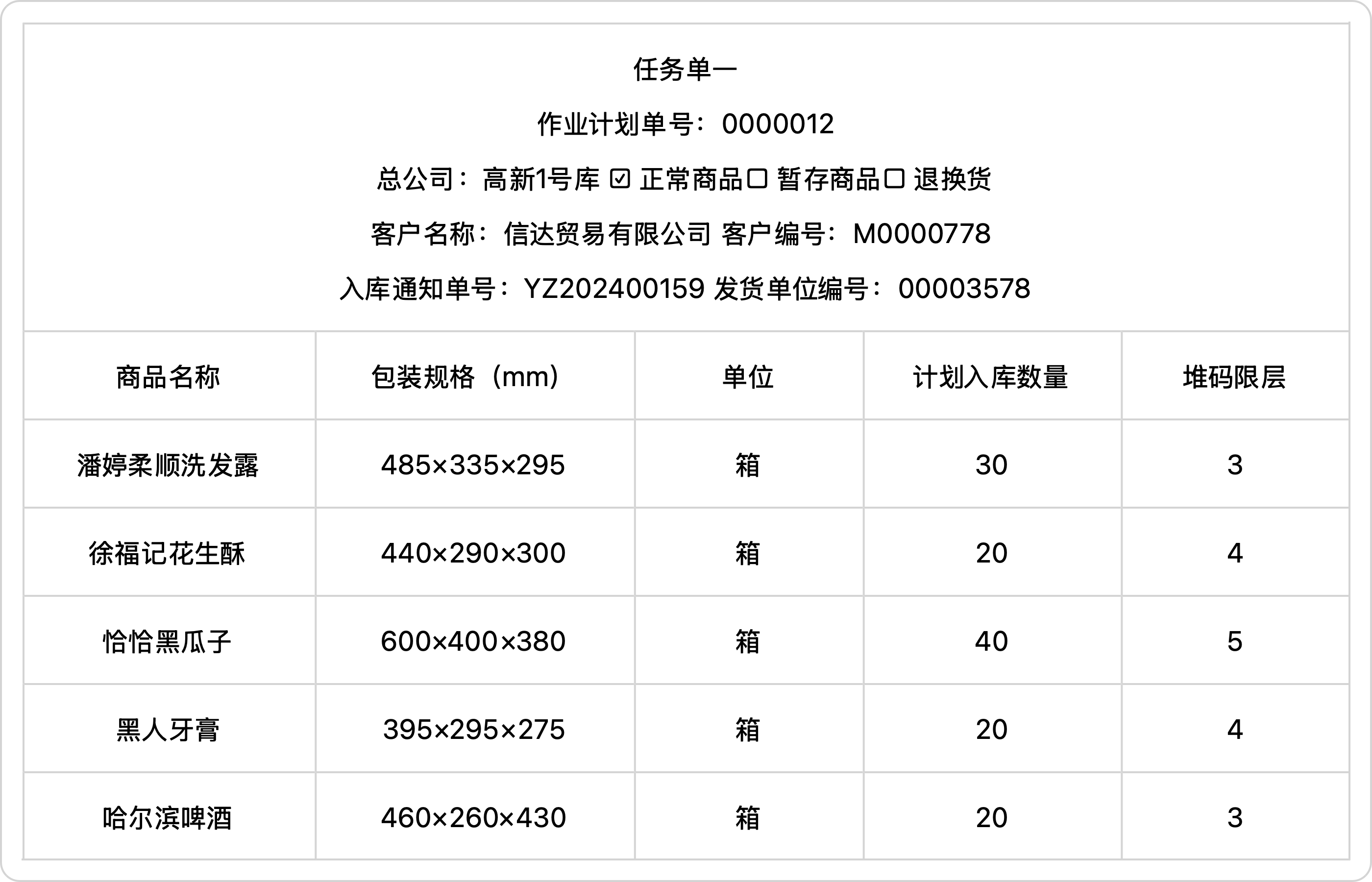 请根据上述信息,使用叉车完成货物上架作业,将货物放置在合理储位上,并熟练完成【WMS】系统操作。