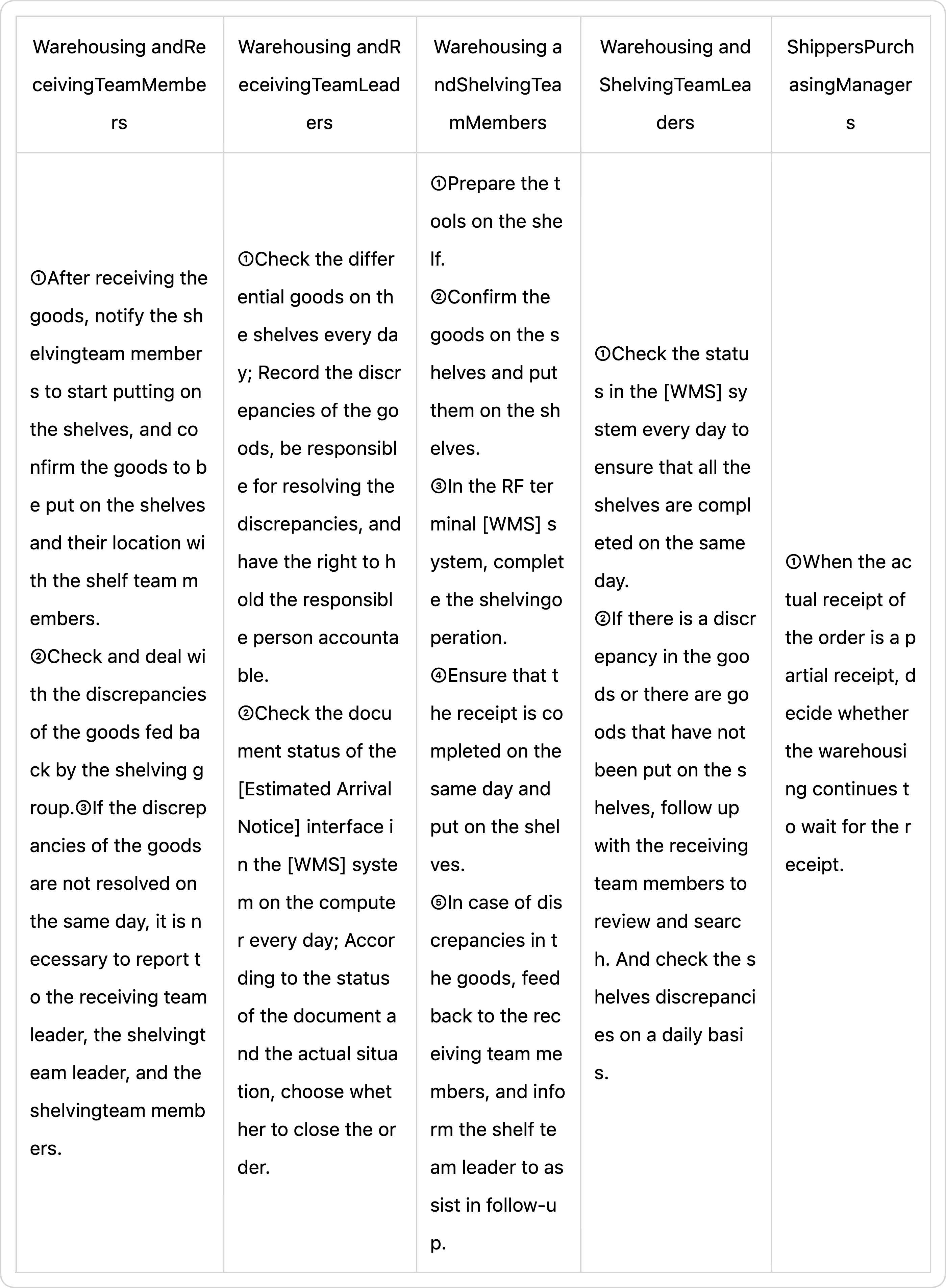 The main ones involved in the goods shelving operation positions include: warehousing and receiving team members, warehousing and receiving team leaders, warehousing and shelving team members, warehousing and shelving team leaders and shippers purchasing managers, and the main work content of each position is shown in Table 1.4.1.