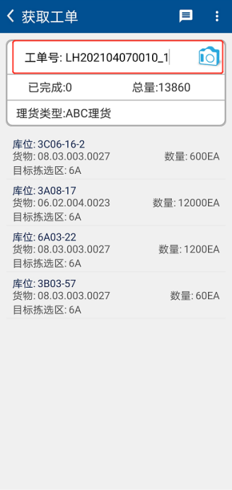 Select [Tallying] on the Home of RF terminal [WMS], click [Remove Listing], scan the barcode on the "Tally Work Order Label" at [Work Order Number] on the [Get Work Order] interface, and the system will display the information of the goods to be removed and the location corresponding to the work order. (Figure 2.3.12, Figure 2.3.13, Figure 2.3.14)