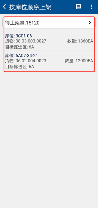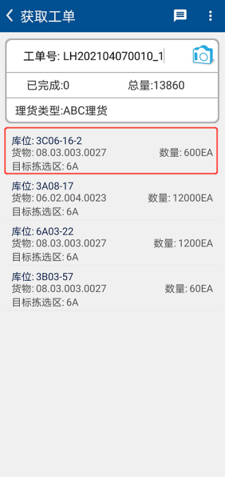 完成下架后,库存组员再获取上架工单,将货物上架。