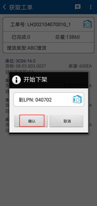 首先,在RF终端【WMS】的【获取工单】界面,点击首行明细,在【开始下架】界面【到LPN】处扫描LPN条码,点击【确认】。(图2.3.15、图2.3.16)
