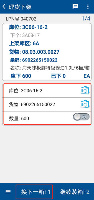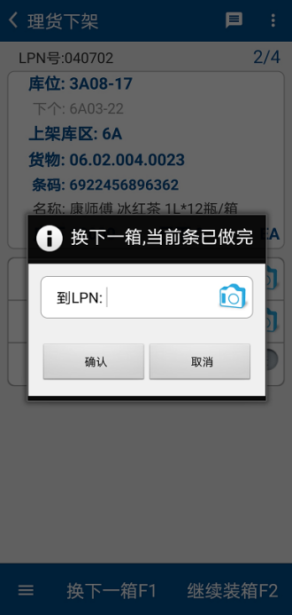 然后,在【理货下架】界面【库位】处扫描库位条码,在【货物】处扫描货品条码,核对下架库位上的实物名称和数量,如果当前箱子已经装满则点击【换下一箱F1】,系统显示【换下一箱,当前条已做完】,弹出扫描新的理货框LPN码。(图2.3.17、图2.3.18)