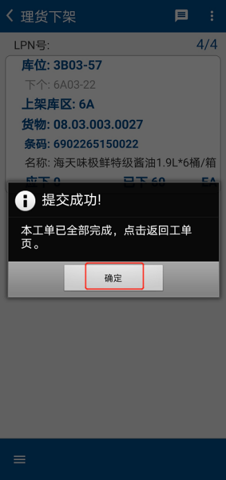 重复以上步骤,直至工单所有库位下架完成后,系统提示【提交成功】,点击【确定】,并将“理货标签”贴在货物显眼位置。(图2.3.19)