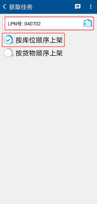 ① 在RF终端【WMS】首页选择【理货】。点击【上架】,在【获取任务】界面勾选【按库位顺序上架】,在【LPN号】处扫描待上架货物上的LPN条码。系统跳转至【按库位顺序上架】界面,显示待上架货物信息及目标库位。(图2.3.20、图2.3.21、图2.3.22)