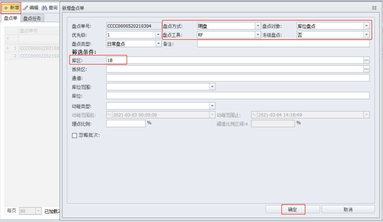 在电脑【WMS】菜单栏打开【盘点单】,在【查询】界面点击【确认】后,进入盘点单界面,点击【新增】,在【盘点方式】处选择【明盘】,在【盘点对象】处选择【库位盘点】,在【盘点工具】处选择【RF】。在【筛选条件】的【库区】处选择需本次盘点的库区。点击【确定】,生成盘点单。(图2.4.2、图2.4.3)