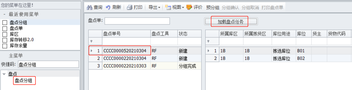 2.根据所创建的盘点作业任务(盘点工单),在RF枪【WMS】系统获取盘点任务。