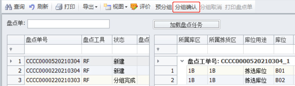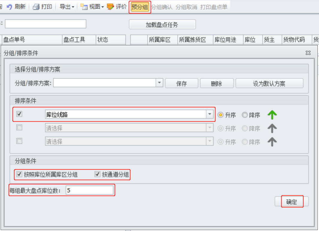 在菜单栏选择【盘点分组】,选中已生成的盘点单,点击【加载盘点任务】,预览盘点任务明细,点击【预分组】,在弹出的【分组/排序条件】界面中勾选【排序条件】-【库位路线】选择【升序】,在【每组最大盘点库位数】处填写数量(例如5),点击【确定】,随后点击【分组确认】,完成盘点工单分组操作。(图2.4.4、图2.4.5、图2.4.6)