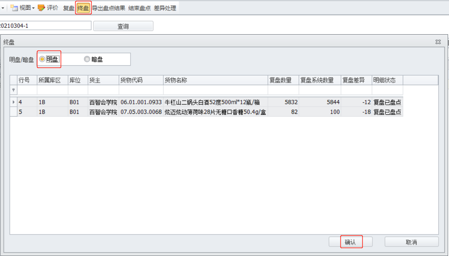 8.直至终盘完成,如存在差异的,由库存组长针对货物进行复核,确认最终差异后,在系统中【结束盘点】。
