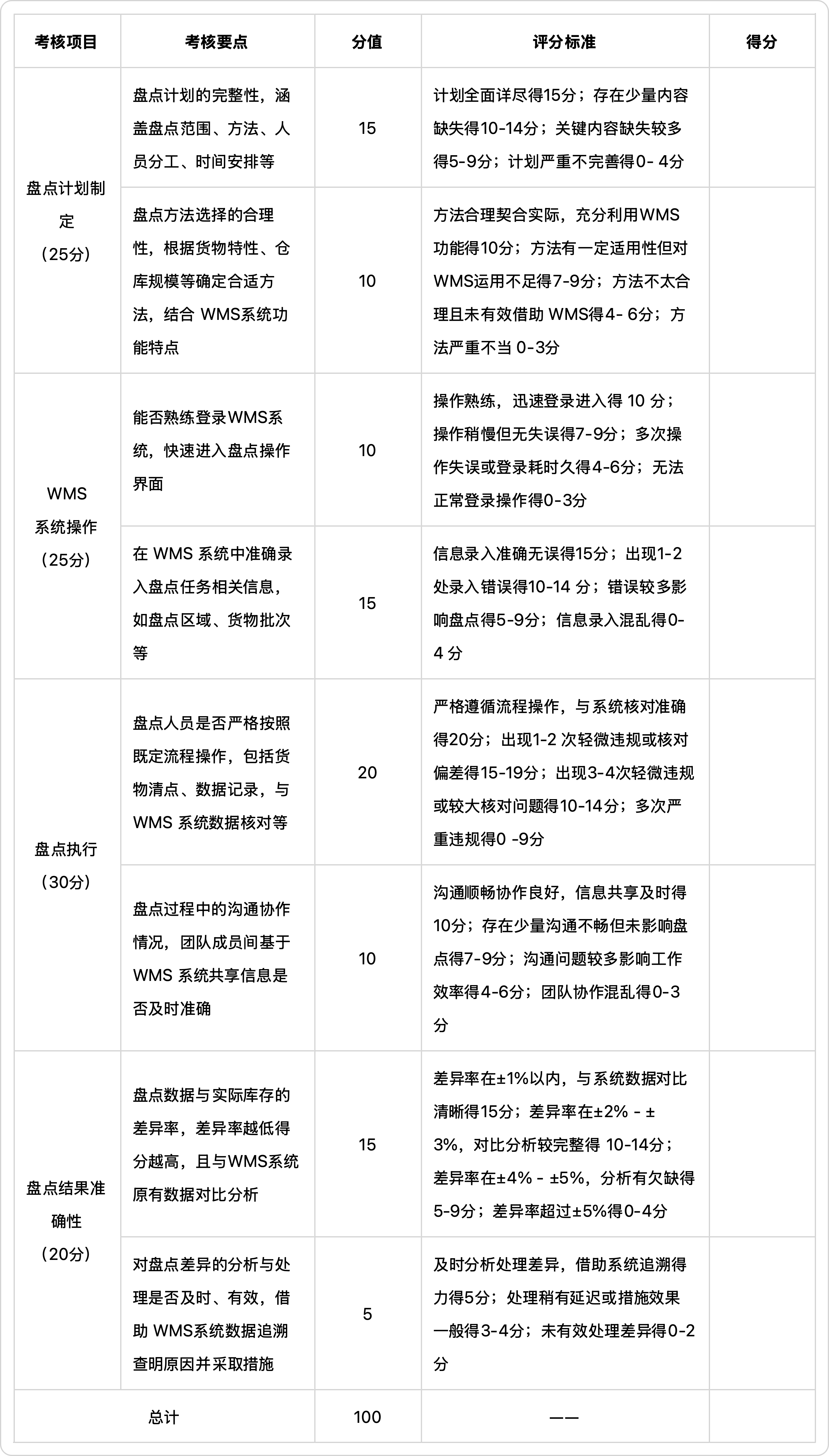3.能够掌握盘点作业的基本技能,包括人员的组织安排盘点前的准备工作现场盘点和盘点结果处理等。