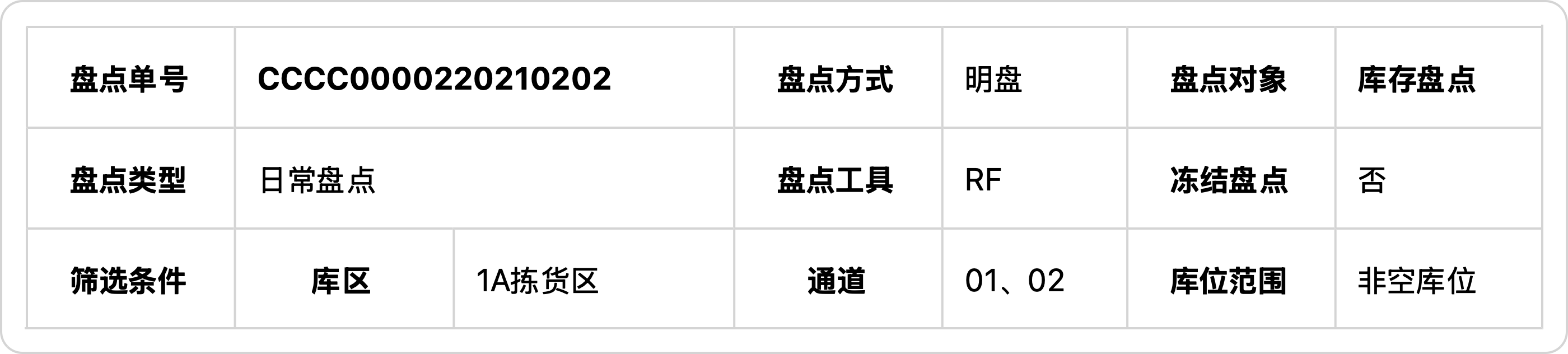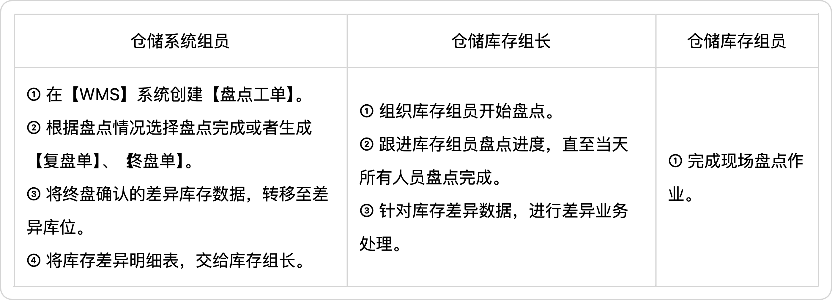 以下词条为盘点作业具体步骤,如选择盘点库位明细为第一步,则用数字标明①,后续步骤请按照作业顺序依次进行编号。// [!code focus]
