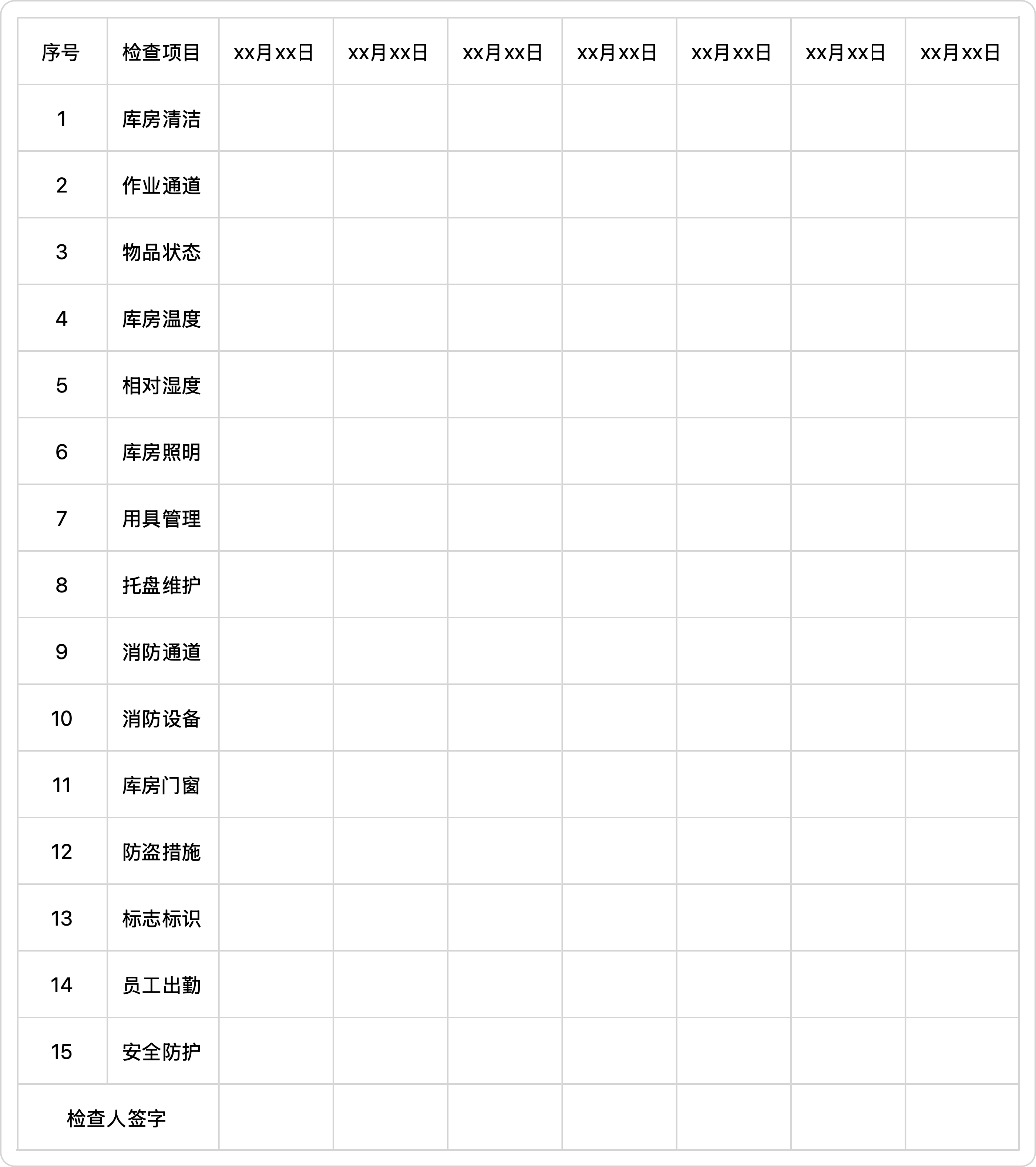 检查完毕后填写表2.5.1 仓库日常检查记录表。