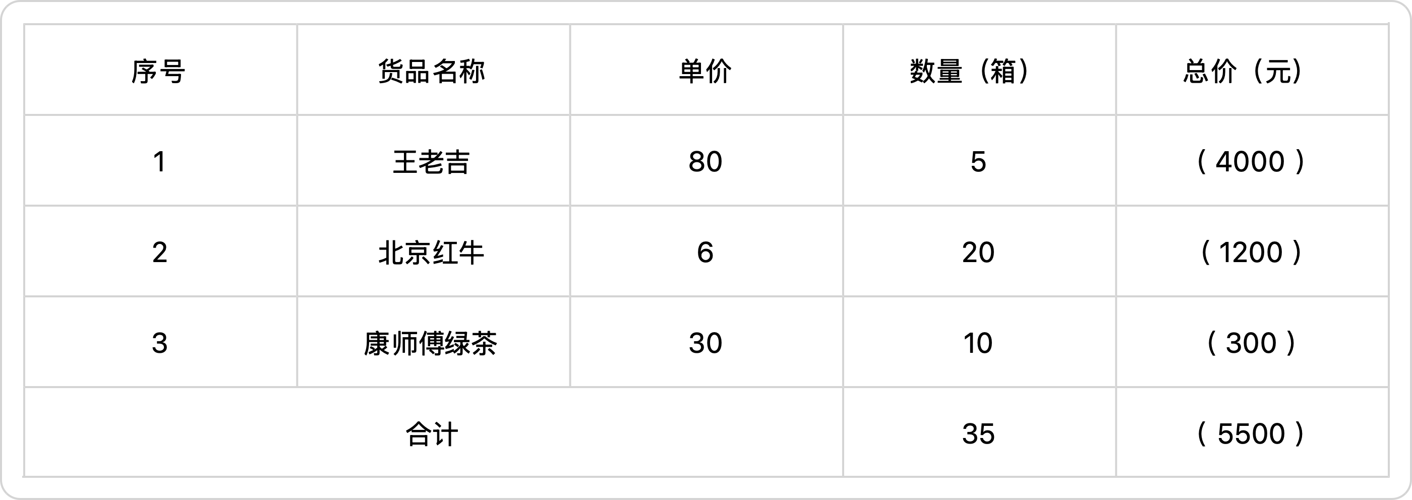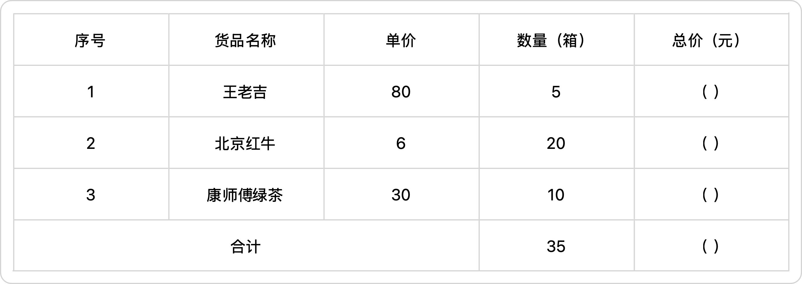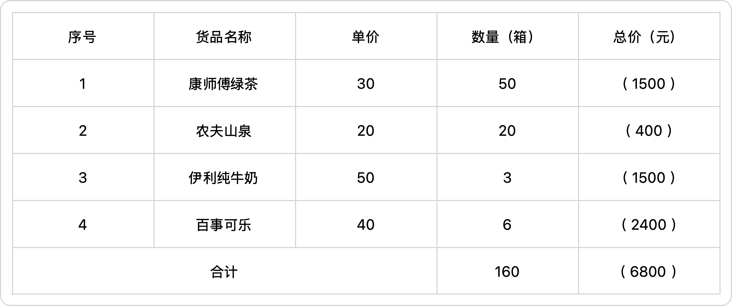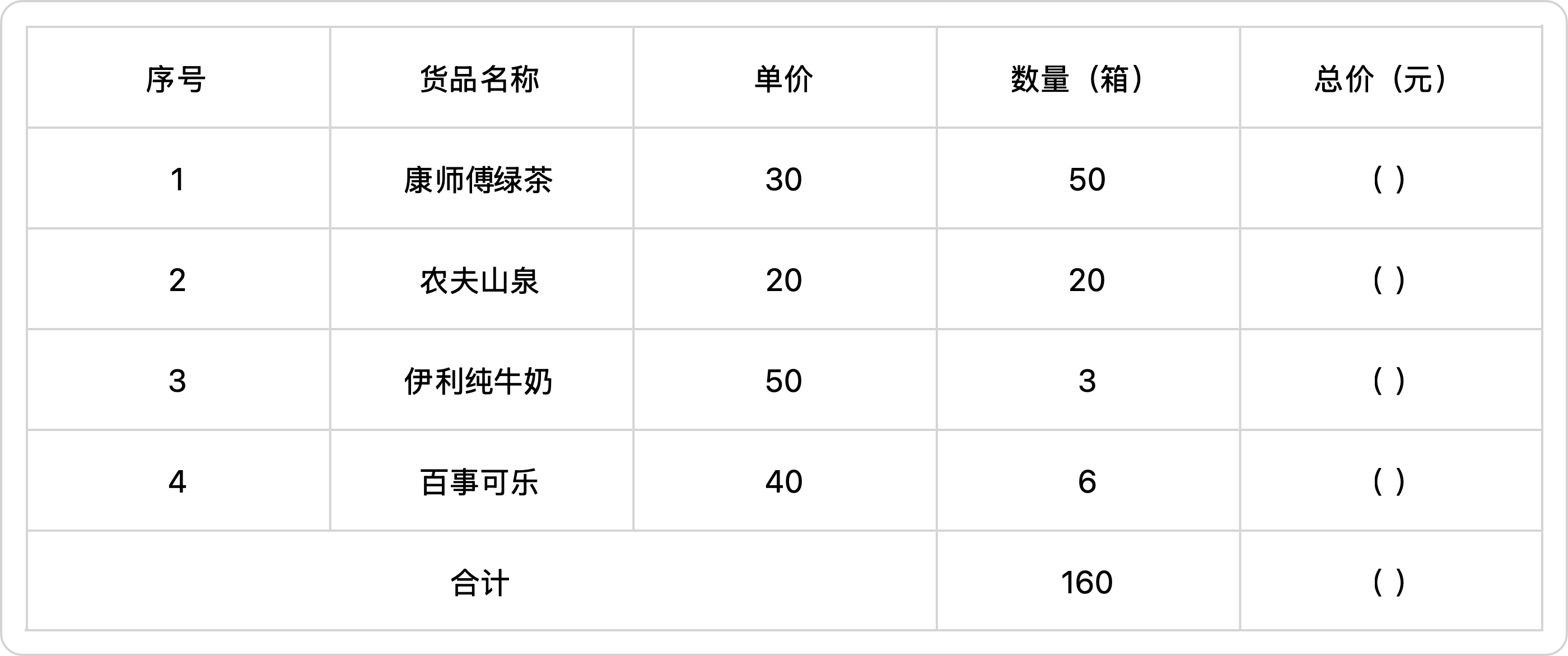 振华仓储有限公司收到来自惠多多超市和优选商贸的采购订单,订单明细如下。请计算每种商品的总价及订单的合计总价,并填入表中。