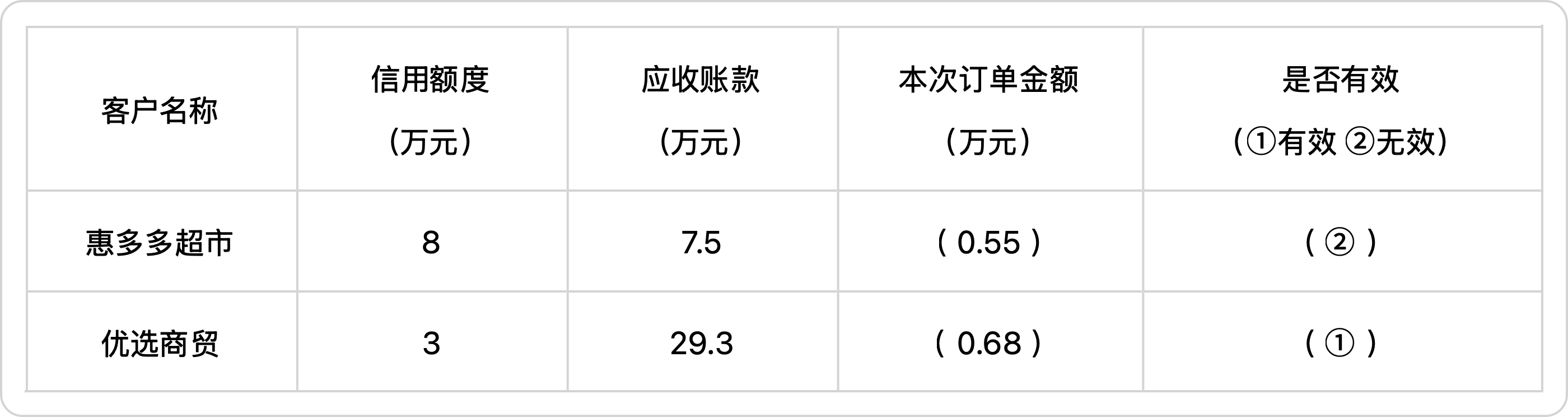 振华仓储有限公司与两家客户都是按月结款,并根据客户的信用状况,分别设定了相应的信用额度,请跟下表中的数据判断两家客户的订单是否有效。