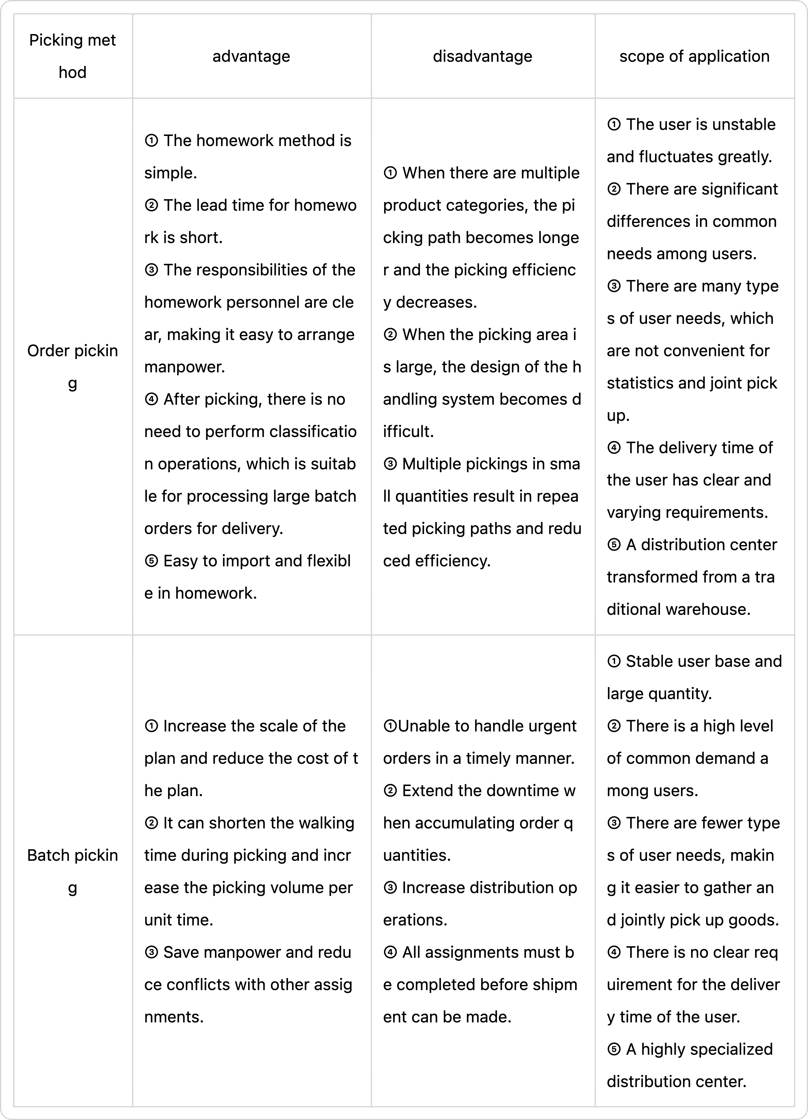 Determine the picking method based on customer order items and inventory distribution, with the principle of improving picking efficiency and reducing picking costs.